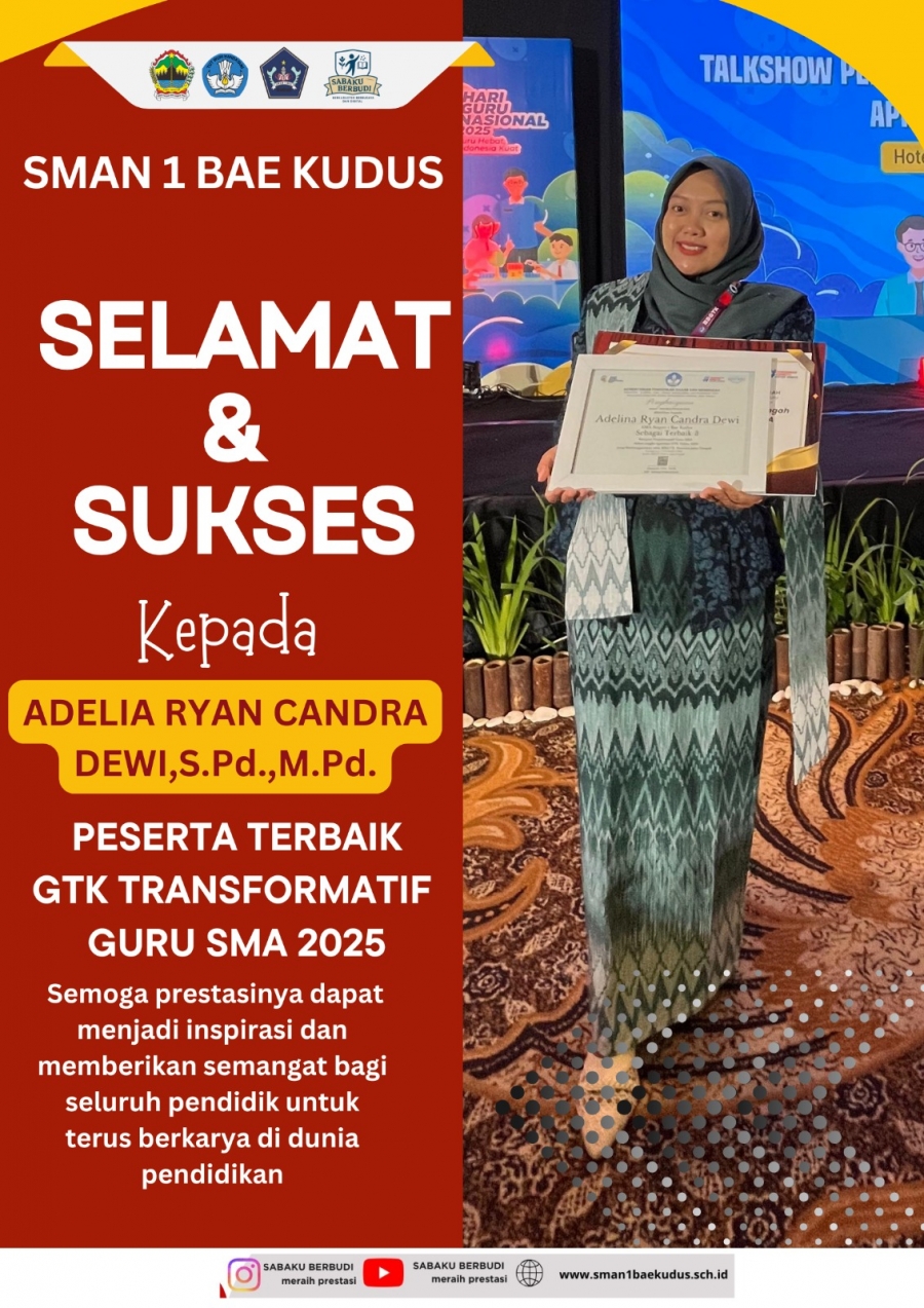Sabaku_Berbudi Prestasi membanggakan kembali diraih oleh SMA N 1 Bae Kudus, sekolah yang dikenal aktif mencetak berbagai capaian gemilang baik di bidang akademik maupun nonakademik. Tidak hanya para siswanya yang terus menunjukkan kemampuan terbaik, para gurupun senantiasa menorehkan prestasi membanggakan. Lingkungan sekolah yang penuh inovasi dan budaya belajar yang kuat menjadikan SMA N 1 Bae Kudus sebagai salah satu institusi pendidikan yang terus berkembang dan menginspirasi.