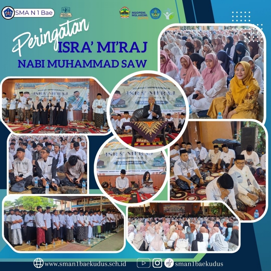 Sabaku Berbudi– Di tengah suasana penuh keprihatinan akibat musibah banjir yang melanda wilayah Kabupaten Kudus di awal tahun 2026, keluarga besar SMA Negeri 1 Bae Kudus menggelar peringatan Isra’ Mi’raj Nabi Muhammad SAW pada hari ini, Jumat (23/1). Bertempat di Indoor sekolah, kegiatan ini mengusung tema yang sangat relevan dengan kondisi saat ini: "Mengambil Hikmah Isra’ Mi’raj: Dibalik Kesulitan, Selalu Ada Kemudahan."